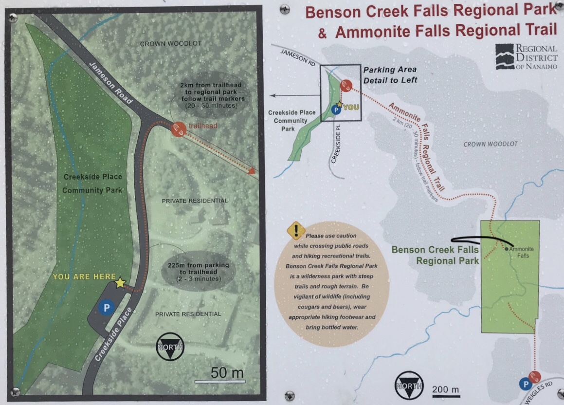 Located on the west side of Nanaimo in benson creek falls Regional Park, on mt benson. turn off the island highway to jingle pot rd, from jingle pot rd turn onto Kilpatrick Rd, then take the first right onto Jameson Rd and flow to the end then turn right on Creekside pl, just a few meter down and to the right is a parking lot and trail map.The trail head will start you off at the end of Jameson Rd.