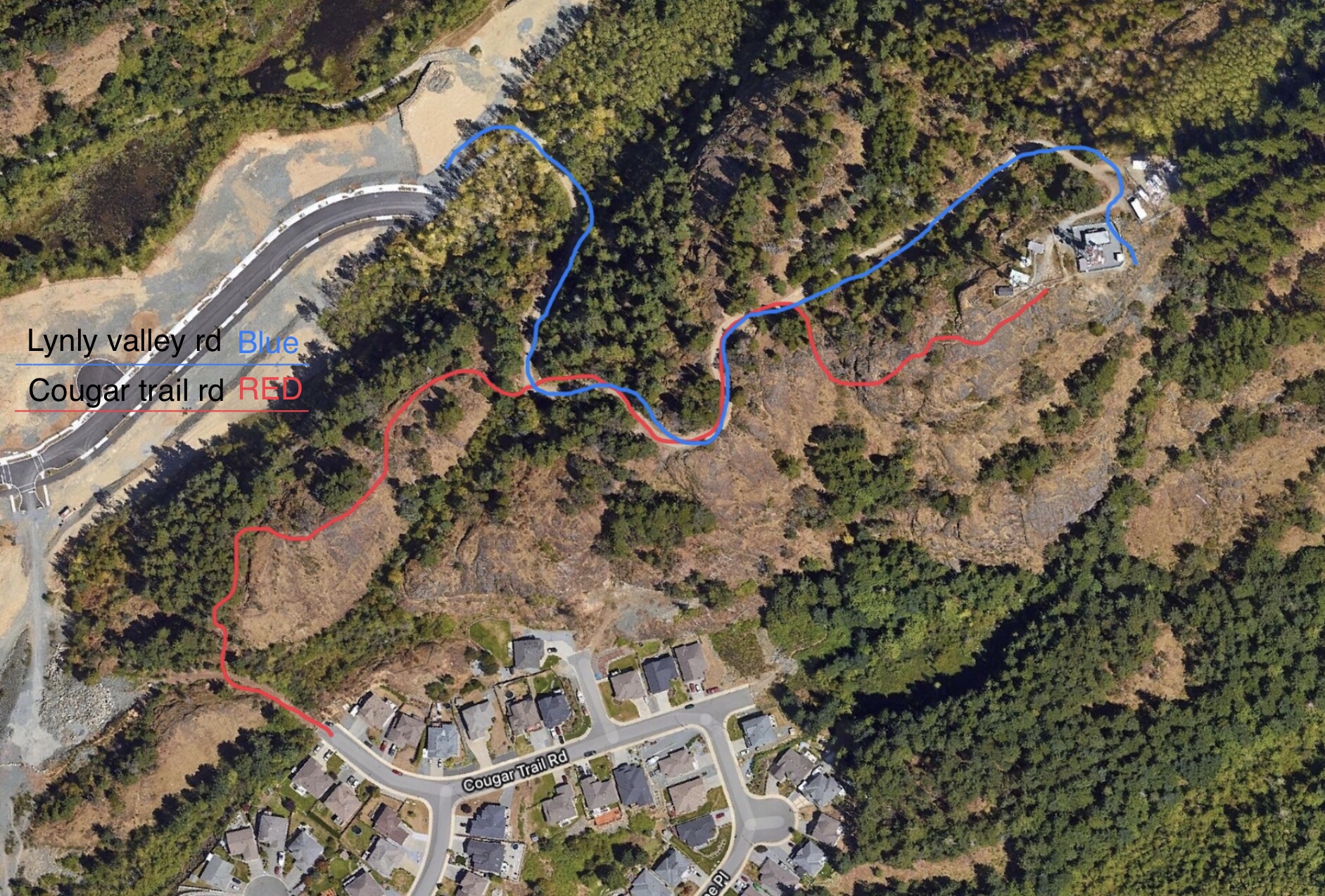 The first trailhead (marked in RED on the map) leads off of a dead-end/unpaved section of Cougar Trail road. About 150 feet from where the street ends, parking where the road is barricaded off, the trail begins on the right. It’s a bit steep, but some well placed footing will start you off without scrambling up the 20ft section. At the top you’ll continue up the dirt trail, as the path then leads onto exposed and moss covered rock. The trail continues along the first ridge, offering a heightened view of the area. The trail will dip down a bit before connecting back to the main gravel road. Following this road, you will pass a yellow gate where you can decide to continue along the gravel road to the top for an easier path, or a smaller trail off to the right hand side, which offers better views as you hike up. The terrain along the smaller trail is steep with loose rock toward the top, so sure footing is required. At the top you’ll find the fenced off radio towers and a view of Nanaimo stretching from Duke Point to Nanoose. Glimpses of the ocean can be seen, but the view is mostly facing inland.