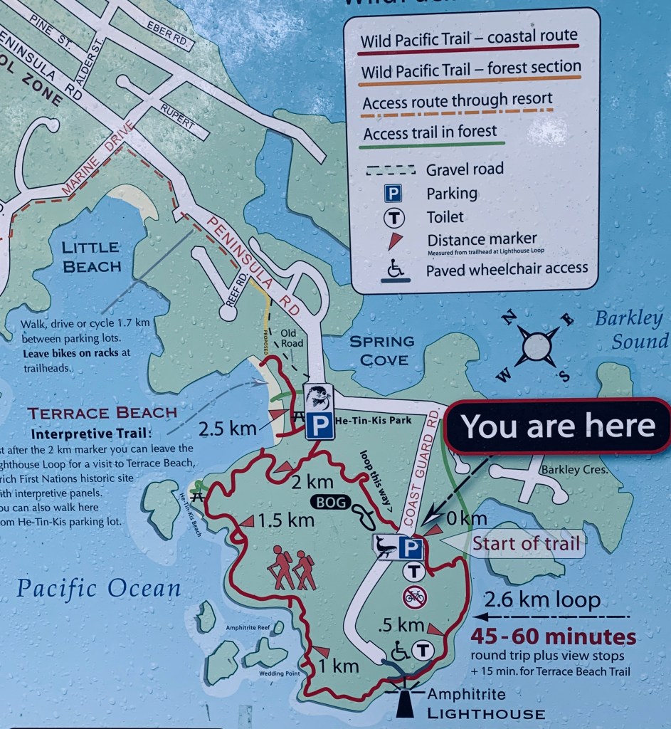 From the Tofino/Ucluelet junction, follow the Tofino/Ucluelet highway (which will turn into Peninsula road) south for 9.7km. Turn right onto Coast Guard drive and continue for 500m to the parking lot on the left. The trail head starts in the parking lot in a clockwise direction.
