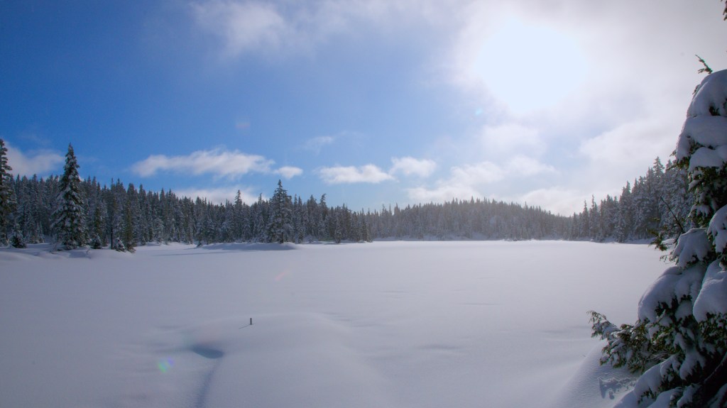 Mt. Washington’s noric lodge also called the raven Lodge, located at the base of the alpine ski hill, it accommodates trail access passes, cross-country skiing, and in our case snowshoe rentals. Once you have purchased your pass and have your gear, the patrolled trails at Paradise Meadows are open to you. There are a few different trails and loops of varying distance around the meadows and lakes to choose from. We opted for the 8km Helen Mackenzie loop.