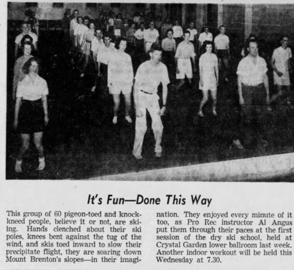 During the first season of the Victoria Ski Club, winter hit the South Island hard, cutting off access to Mount Brenton. Government-funded dry ski camps were held at Victorias Crystal Garden lower ballroom for new skiers, and beginner ski classes were conducted on the eagle heights slopes, off Renfrew Road behind Shawnigan Road. At one point, lessons were even held at Beacon Park in downtown Victoria.