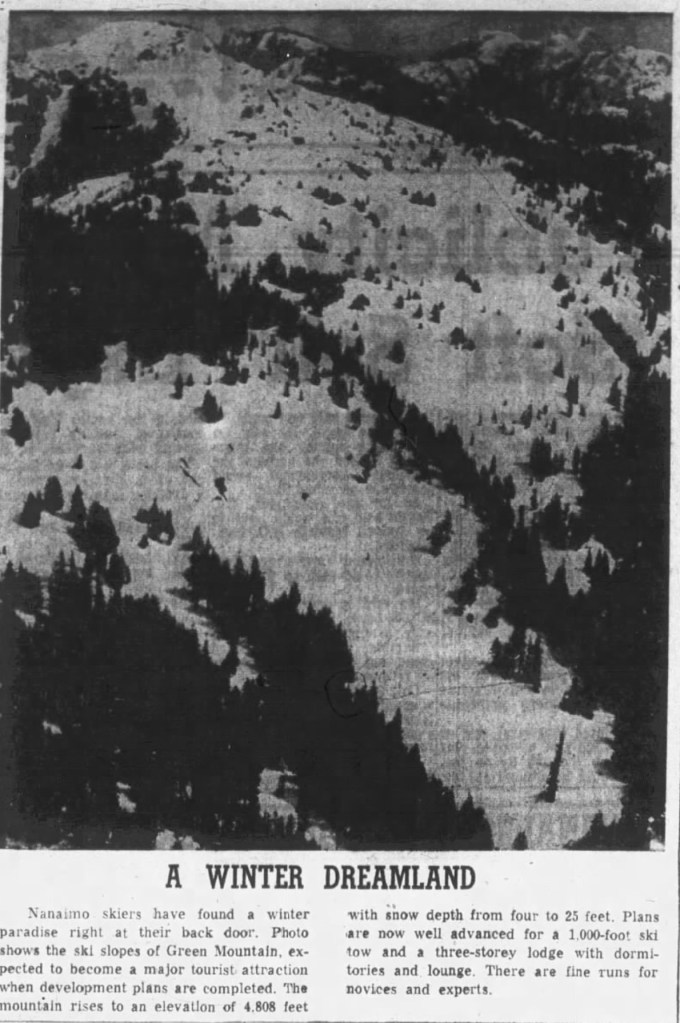 - Source: Daily Colonist, Sunday, March 2, 1958 Page 8 Link: https://archive.org/details/dailycolonist0358uvic_0/page/n37/mode/1up?view=theater&q=skiing+ski+skis+mount